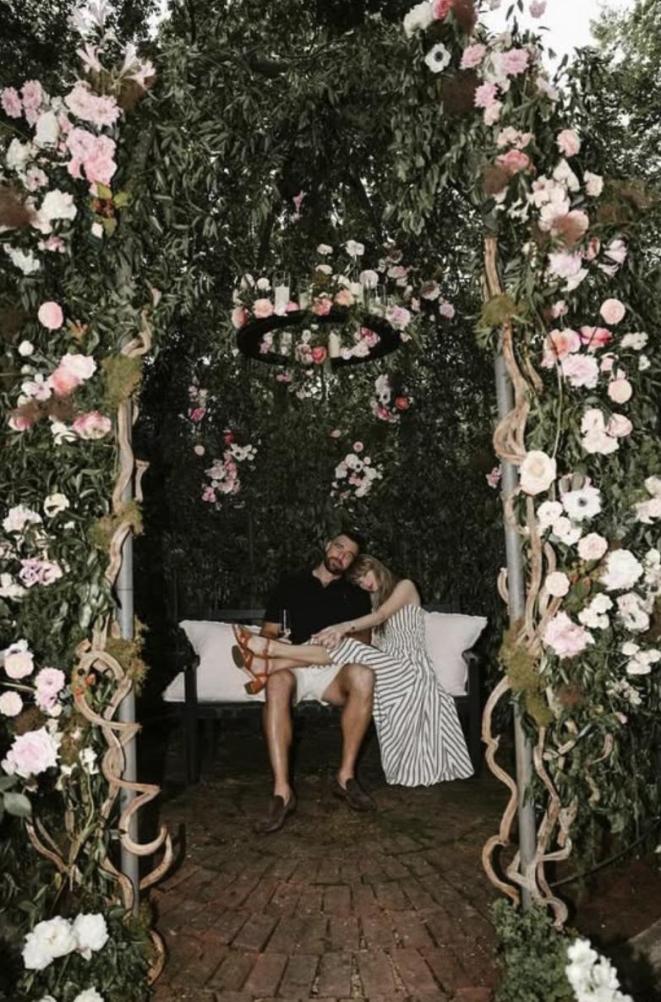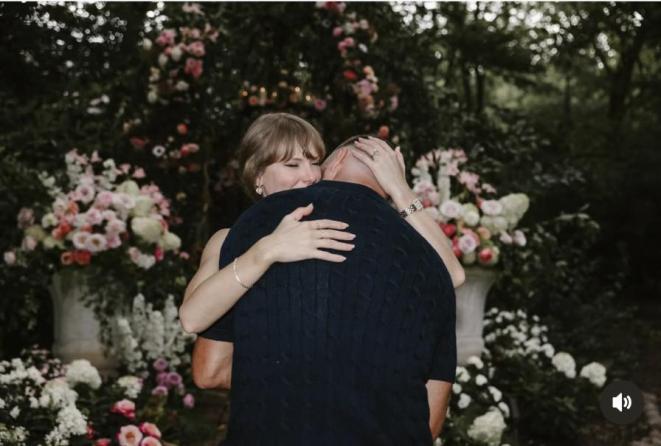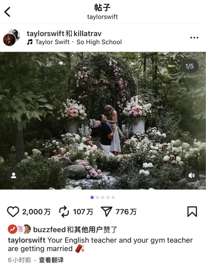 两人在社交平台上发布了宣布了这个好消息,并附上了Kelce在鲜花盛开的花园里向霉霉求婚的照片,并配文:“你的英语老师和你的体育老师要结婚了。”
