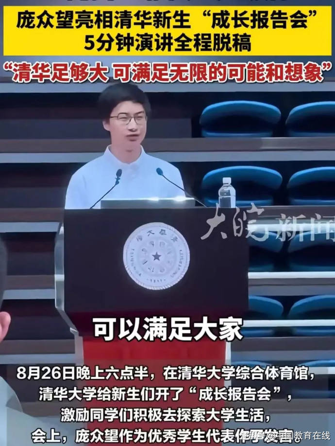 据媒体报道,清华大学的大一新生李同学称,整个发言大约持续了5分钟。之后学校播放了2025年招生宣传片,庞众望在其中亮相。