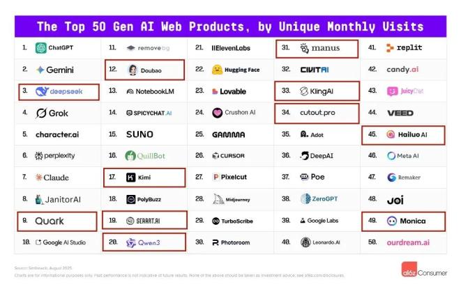 从总榜单来看,在网页端榜单中,DeepSeek排名第3,仅次于ChatGPT和Gemini,共有11款确认为中国公司开发的应用上榜,其中夸克、豆包、Kimi和Qwen跻身前20名,海螺、可灵等应用也在榜单内。