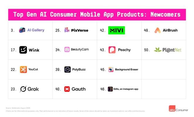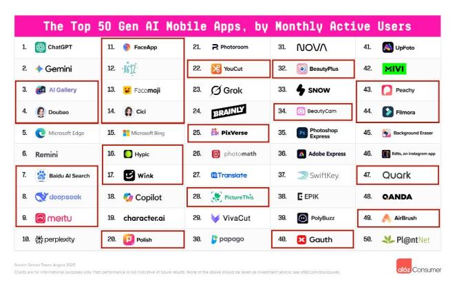 网页端榜单中还有多款由中国开发但主要面向海外市场的产品,视频生成模型的技术优势尤为突出,其中部分甚至在中国境内有访问限制,包括:海螺(Hailuo)、可灵(Kling)、SeaArt(图像生成)、Cutout.Pro(图像编辑)、Manus和Monica(生产力工具)等。在移动端TOP 50应用中,确定为中国公司产品的有22款。美图公司的应用独占5席(Meitu、BeautyPlus、BeautyCam、Wink、Airbrush),字节跳动的豆包、Gauth(教育科技)、海外版醒图Hypic(影像编辑)也上榜了。