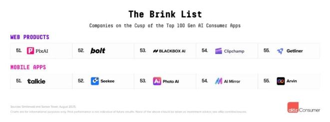 若排除首期榜单,另有5家企业因近期增长势头同样符合持续在榜标准:Claude、DeepAI属通用助手,JanitorAI专注虚拟陪伴,Pixelcut为图像编辑工具,Suno主打音乐生成。