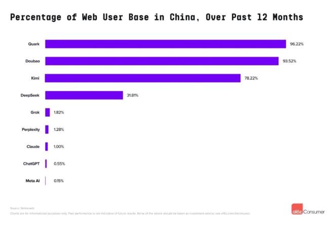 其中夸克的国内用户数占比达到96.22%,豆包的国内用户占比93.52%,Kimi也有78.22%的流量来自国内。