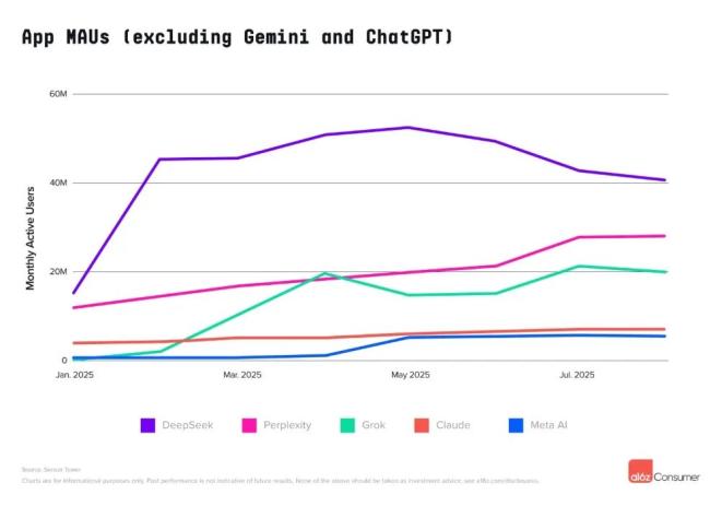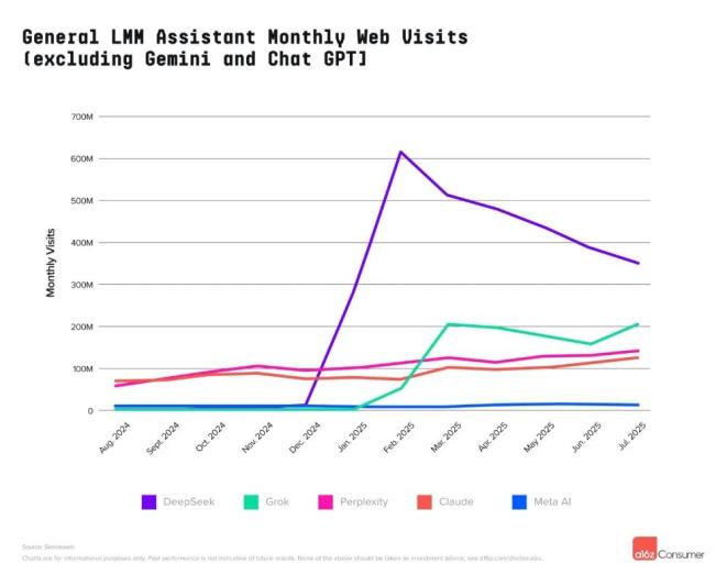 DeepSeek在移动端的增长均已明显放缓,月活跃用户数较峰值下跌22%。在网页端,DeepSeek的下跌更为明显,较2025年2月的峰值下降超过40%。