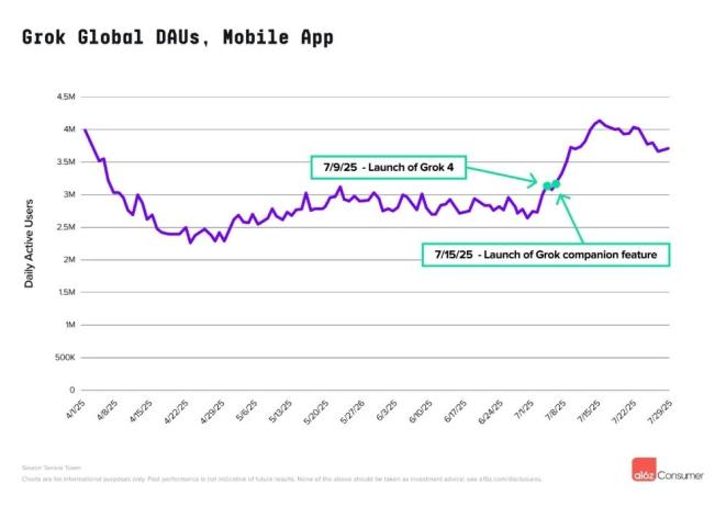Grok在2025年7月经历了移动使用量的显著增长,7月9日发布了新版Grok 4后,当月涨幅接近40%。随后在7月14日推出的AI伴侣虚拟形象功能中,动漫形象Ani尤其受到欢迎。
