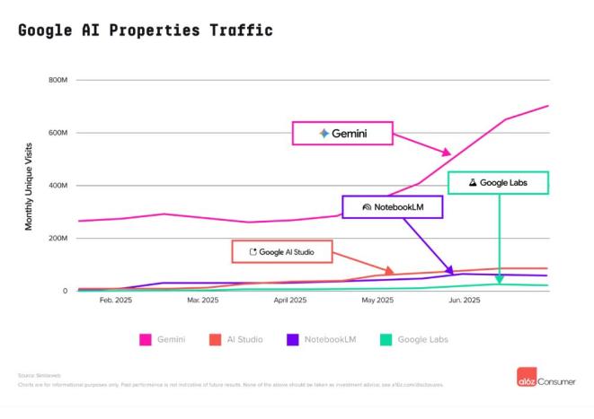 谷歌本次共有4款产品登上网络端榜单,这是a16z首次能够对谷歌不同产品的流量进行独立统计并分别纳入排名。