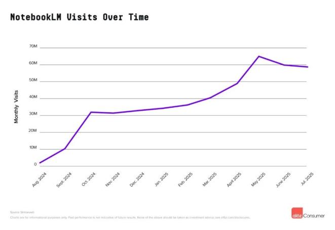 NotebookLM紧随其后位列第13名,该产品最初作为Google Labs的一部分推出,如今已独立运营网站。NotebookLM在近一年前迅速走红,此后持续稳定增长,仅在夏季出现小幅下滑,a16z猜测可能与学术用户暂时流失有关。