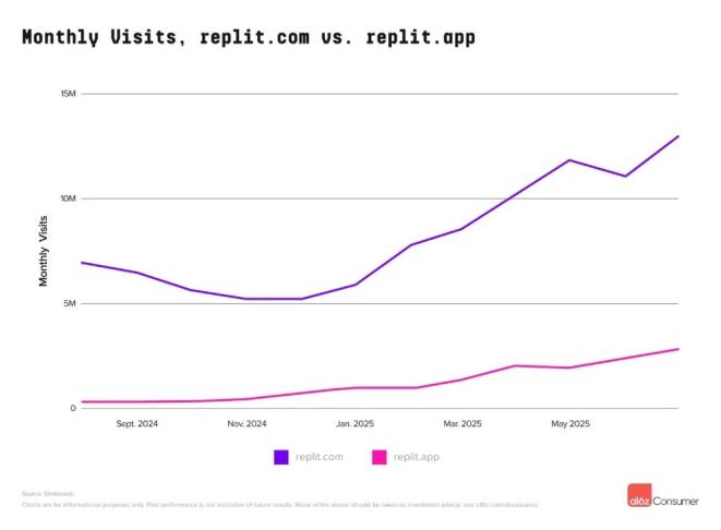 信用卡面板提供商Consumer Edge的数据显示,美国某头部Vibe Coding平台的用户群在注册后数月内收入留存率持续超过100%。这意味着即使计入流失用户,该群体每月总体支出仍在增长。这些平台也带动了其他AI产品的使用,通过Replit和Lovable构建并发布的、未使用独立域名的网站,流量分别计入replit.app和lovable.app。并且,两者自身流量均较为显著,lovable.app的流量本可进入前50名,但低于其开发平台主站流量。