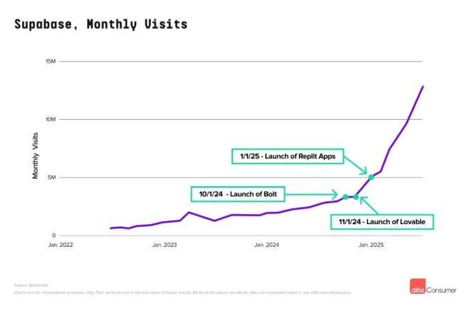 Vibe Coding技术栈的相关产品也迎来流量激增,因为开发者采用这些工具部署项目。但由于非AI原生企业,它们无法进入本榜单,典型案例如数据库服务商Supabase。Supabase的流量增长与核心Vibe Coding平台的崛起高度同步,过去九个月的增速较前几年明显加快。a16z认为Vibe Coding领域仍存在显著增长空间和新产品机会。