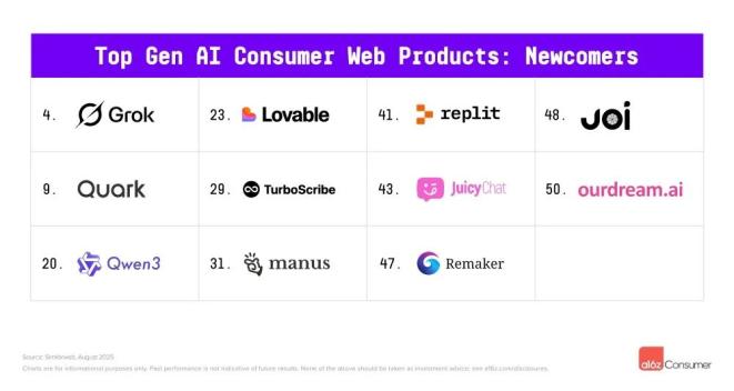 a16z总结称,本版榜单最显著的发现就是AI生态体系开始逐步趋于稳定:网络端榜单因流量增长新增11个新产品,相比2025年3月榜单的17个新入榜产品有所减少。
