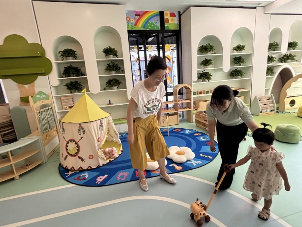 师资方面,首批10名教师均来自上海儿童世界杨浦幼儿园托育部的骨干团队,全部持有高级育婴师或早教资质,平均教龄超10年。托立方托育园园长应婷婷原先是上海儿童世界杨浦幼儿园的副园长,如今来到托立方,全职为家长和孩子们服务。应婷婷告诉记者:“我们采取渐进式适应策略,建议家长从半日托开始,让孩子在熟悉环境中逐步建立安全感。”