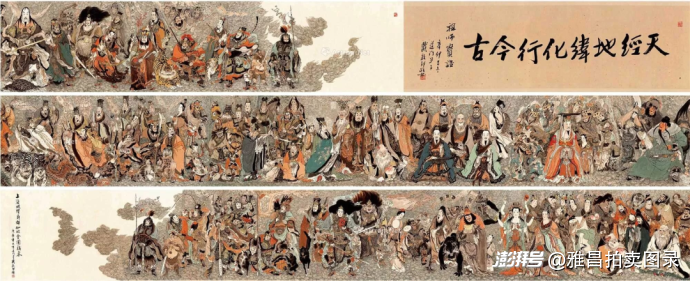 在前不久结束的2025年西泠印社春拍会上,戴敦邦《群仙欣会图》手卷颇引人注目。据拍卖行介绍:本卷为戴敦邦先生为上海城隍庙倾力创作的巨幅壁画《群仙欣会图》之稿本,整卷长达十八米,高近70厘米,画心有13余米,是戴老迄今为止尺幅最宏大之长卷,描绘仙界场景最为恢宏的绘画作品,也是市场唯一壁画稿本巨制。