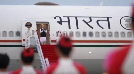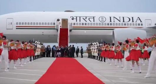 随后是莫迪走出机舱,双手合十向现场人员致意。视频显示,机场铺就了红毯,还有仪仗队伍及舞蹈方阵欢迎莫迪的到来。