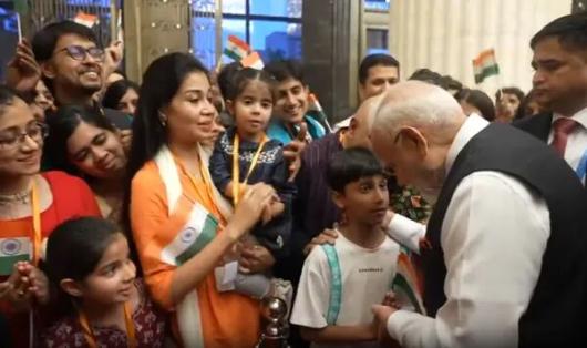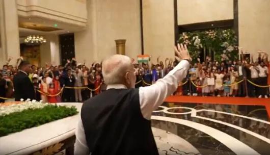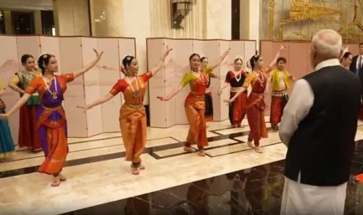莫迪欣赏音乐舞蹈表演视频最后以莫迪在大堂跟欢迎的侨民挥手致意作为结束。