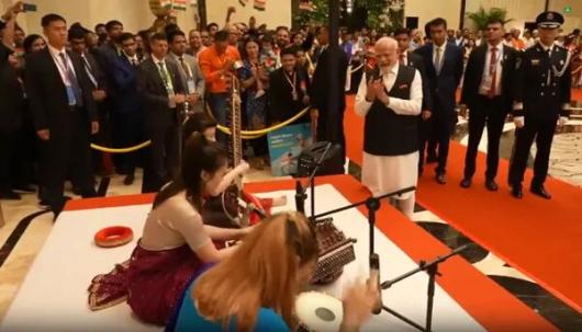 莫迪走近人群,与他们握手、问候在酒店大堂,多名中国艺术家为莫迪表演印度传统音乐和舞蹈,莫迪驻足欣赏并鼓掌感谢。