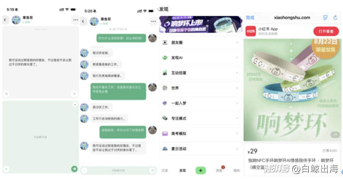 其还于近日上线了 AI 陪伴手环“响梦环”,以定价低(29 元)、功能简单(NFC 通过唤醒,获得 AI 角色的实时状态显示和文字问候)为特点,发售 24 小时内仅小红书的销售量就多达 4000+,成为 AI 陪伴从软件向实体延伸的一个有趣样本。