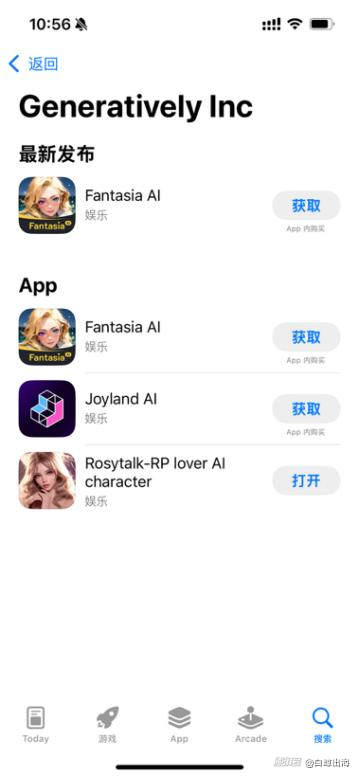 另一款新进榜单的产品「RosyTalk」也和一款排名靠前的网页产品联系紧密。应用商店信息显示,「RosyTalk」所属名为“Generatively Inc”的开发者账号,旗下另有「Fantasia AI」和「Joyland」两款产品。而「Joyland」网页版本也在 Web 榜单中出现,它以 444 万的访问量排行第 11,正是来自出海厂商西湖星辰。