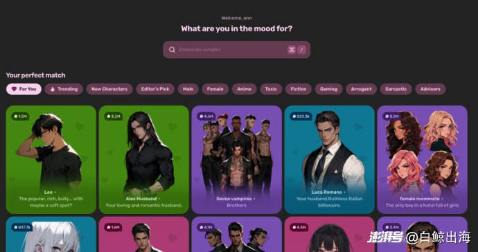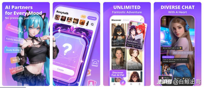 虽然这一开发者账号下的三款产品都是 AI 社交方向的,侧重略有不同。「RosyTalk」在交互形式上类似网恋模拟器,推送的 AI 角色也以真人形象的成人为主,对于相对大龄的用户比较有吸引力;「Joyland」覆盖角色类型广泛,而「Fantasia AI」则对二次元等元素有所侧重。