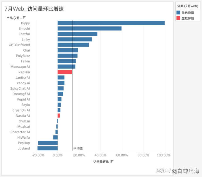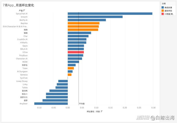 从月活环比变化来看,近 2/3 的产品月活实现了环比增长。增速靠前的产品依旧集中在角色扮演品类,其中「SpicyChat.AI」7 月月活 20 万以 29.63% 的环比增长率领跑品类增速;虚拟伴侣则实现了全员月活环比增长。
