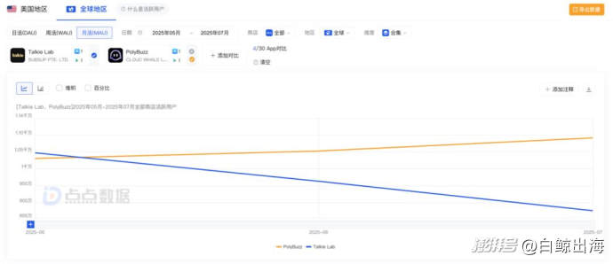 另一个第三方数据平台点点数据也呈现了类似的PolyBuzz月活反超Talkie的趋势,但具体数值存在差异,仅供参考