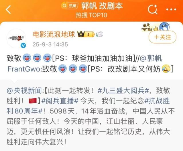 今天上午,网友纷纷喊话《流浪地球》系列导演郭帆:要边看阅兵边改剧本了……