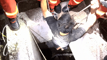 “戴上帽子,你先别动,我们马上救你上来!”救援人员小心翼翼地俯身井口,为老人戴上防护头盔,最大程度降低二次伤害的风险;接着,利用吊桶,一点一点、小心翼翼地将覆盖在老人身上的泥土、水泥板等重物吊至井上,逐步解除对老人身体的压迫。