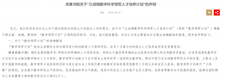 清华大学求真书院关于“丘成桐数学科学领军人才培养计划”的声明。网页截图