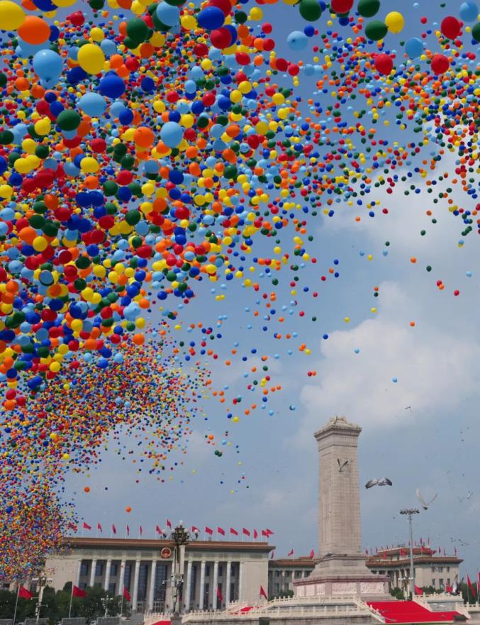 9月3日,纪念中国人民抗日战争暨世界反法西斯战争胜利80周年大会在北京隆重举行。 图为现场放飞气球和鸽子。 新华社记者 牟宇 摄
