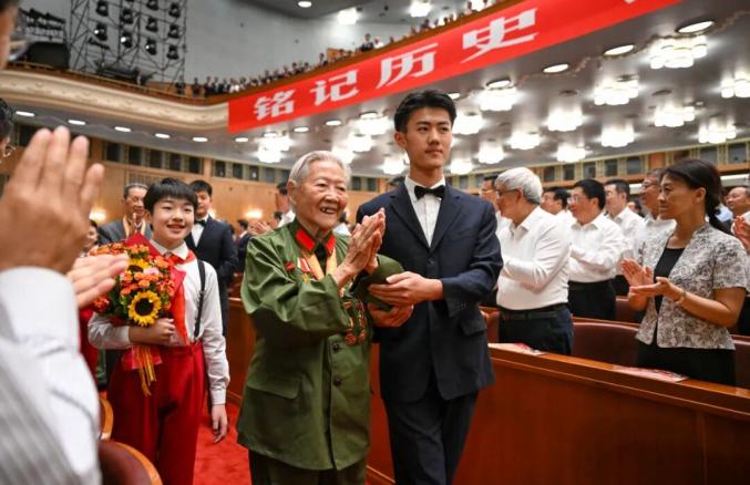 9月3日晚,纪念中国人民抗日战争暨世界反法西斯战争胜利80周年文艺晚会《正义必胜》在北京人民大会堂隆重举行。图为抗战老战士老同志代表来到大礼堂观众席就座,全场起立报以热烈掌声。 新华社记者 谢环驰 摄