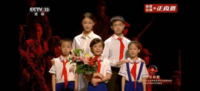 左一男孩为林晨。温州9岁男孩林晨是受邀参演第五篇章第一个节目《如你所愿》中的四位少先队员之一。站在人民大会堂的舞台上,灯光打在他稚嫩却坚定的脸庞上。当他念出“如你所愿,如你所愿,今日中国,捍卫和平,守护正义!”这句台词时,他仿佛看到了80年前那些为今天幸福生活献出生命的先辈们。