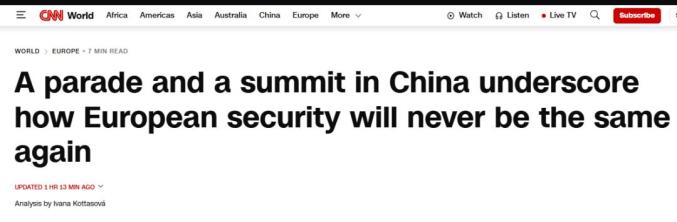 CNN刊登的一篇分析文章认为,8月底举行上合组织天津峰会与9月3日举行的中国人民抗日战争暨世界反法西斯战争胜利80周年纪念大会上,出席活动的各国政要虽然并非在所有议题上都观点相同,但一定有这样的共识:以西方为中心的国际秩序正在被改变。