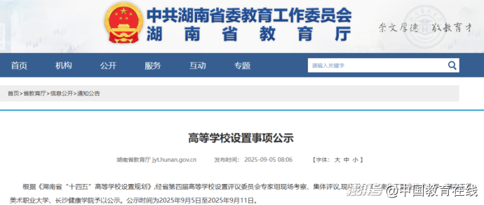 9月5日,湖南省教育厅发布《高等学校设置事项公示》,根据《湖南省“十四五”高等学校设置规划》,经省第四届高等学校设置评议委员会专家组现场考察、集体评议,将拟设置湖南化工职业技术大学、湖南工艺美术职业大学、长沙健康学院。