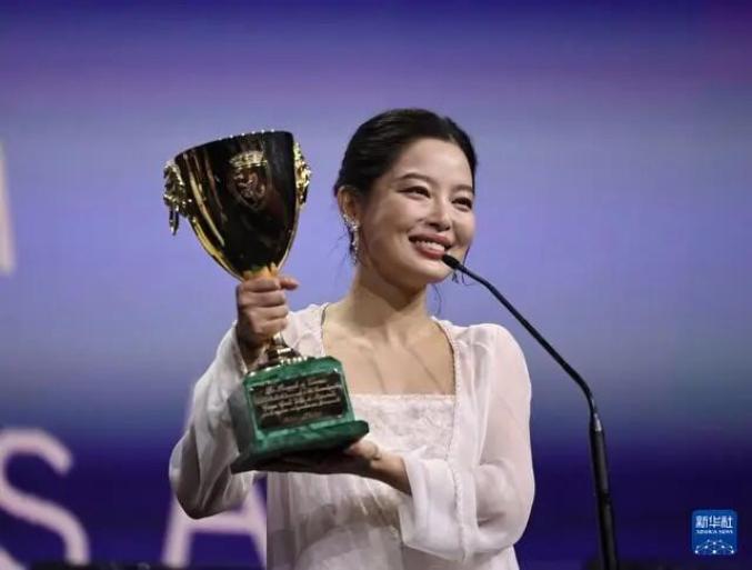 9月6日,在意大利威尼斯,辛芷蕾夺得第82届威尼斯电影节最佳女演员奖。新华社记者 李京 摄《日掛中天》由蔡尚君执导,辛芷蕾与张颂文、冯绍峰等联袂出演。影片讲述一对昔日恋人分别多年后在南方小城重逢,却被命运裹挟最终走向悲剧的故事。影片拍摄地覆盖广东省多座城市,展现独特的岭南文化风貌。