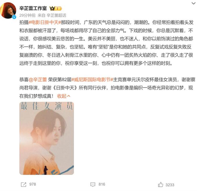 原标题:《热搜第一!女演员辛芷蕾,威尼斯影后!》