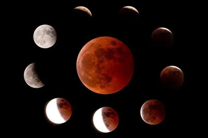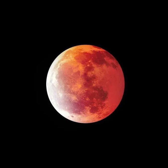 食既→食甚→生光:高能预警!本次月全食最核心阶段,该阶段月球整个进入地球本影,将呈现为暗红色,俗称“血月”。