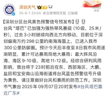 据@深圳天气消息——台风“塔巴”已加强为强热带风暴级(10级,25米/秒),过去3小时继续向西北方向移动,目前位于深圳偏南方约298公里的南海海面上,已进入深圳市300公里防御圈。