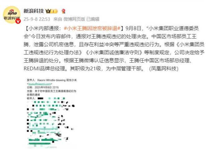 有媒体报道,“小米集团职业道德委员会”今日发布内容邮件,通报对王腾违规违纪的处理决定。中国区市场部员工王腾,泄露公司机密信息,且存在利益冲突等严重违规违纪行为。根据《小米集团员工违规违纪行为处理办法》《小米集团诚信廉洁守则》等制度规定,公司决定给予王腾辞退的处分。