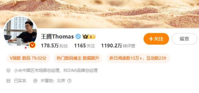 王腾此前是小米内部公开知名度较高的高管之一,也是微博平台上的头部数码博主。根据其社交媒体主页显示,他账号“王腾Thomas”认证信息为小米中国区市场部总经理、Redmi品牌总经理,拥有超过178万粉丝,V指数(微博影响力指标)达79.02分,属于“热门数码博主”。数据显示,其单日阅读量超过10万,视频累计播放量达3861.5万。