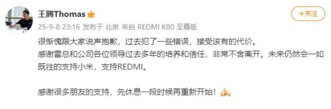 原标题:《小米中国区市场部总经理王腾因泄密被辞退,曾被雷军点名“动不动泄密被罚款”,本人发文道歉:过去犯了一些错误,接受该有的代价》