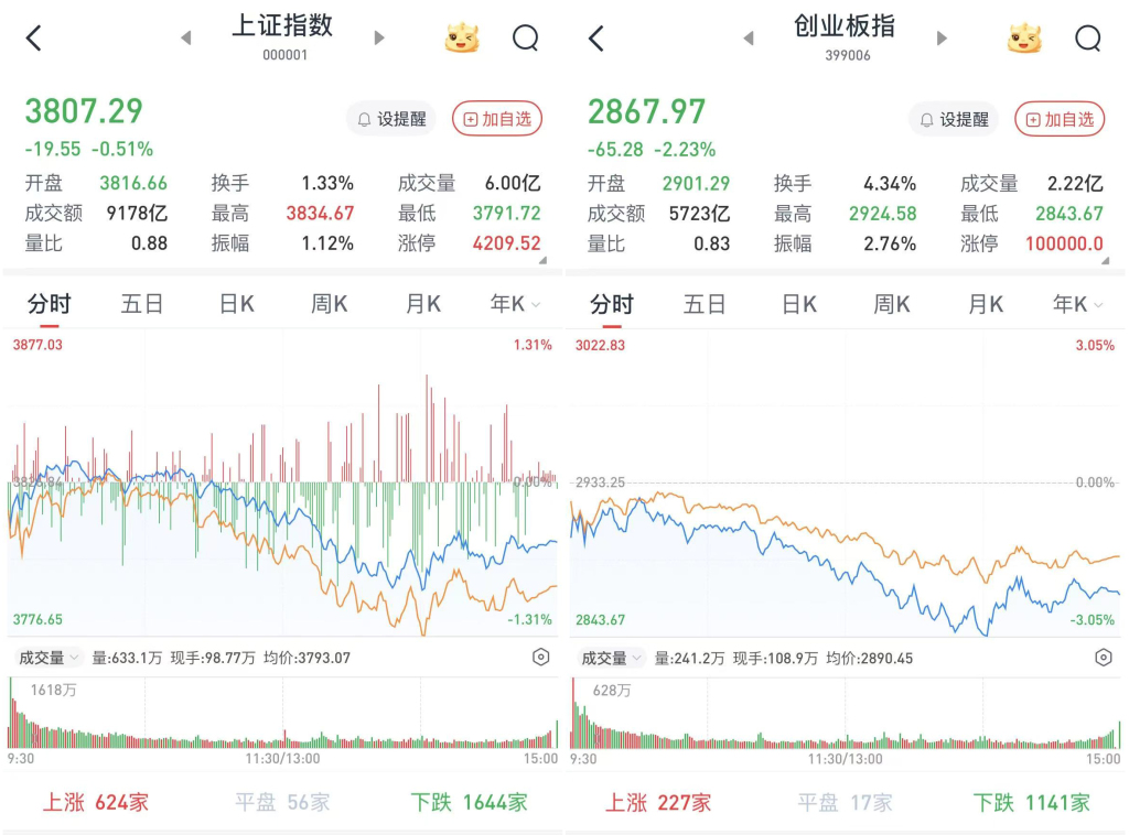 至收盘,上证综指跌0.51%,报3807.29点;科创50指数跌2.38%,报1245.53点;深证成指跌1.23%,报12510.6点;创业板指跌2.23%,报2867.97点。
