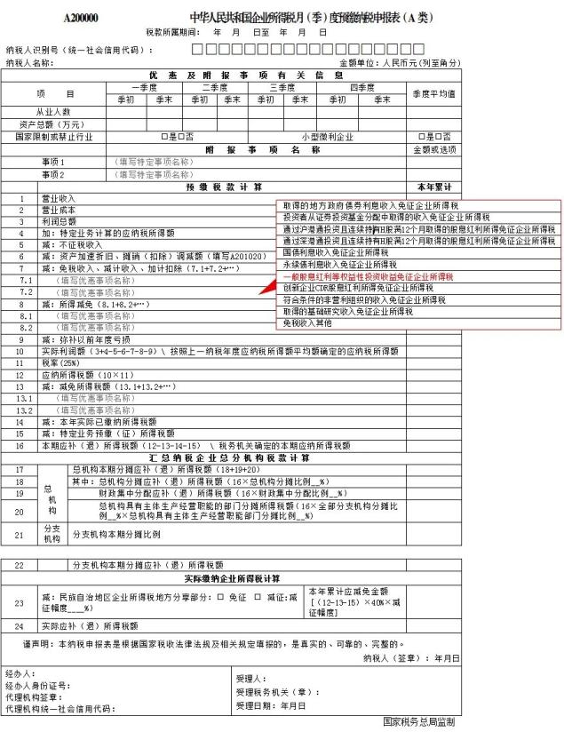 在《A200000中华人民共和国企业所得税月(季)度预缴纳税申报表(A类)》第7行次“免税收入、减计收入、加计扣除”点击增行。在“免税收入”中选择“一般股息红利等权益性投资收益免征企业所得税”。