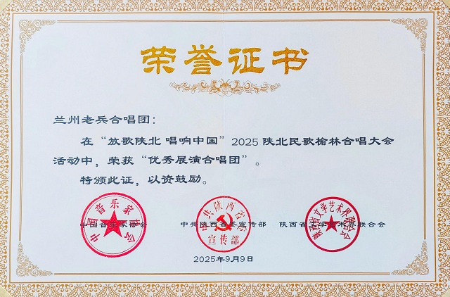 9月9日,由中国音乐家协会、中共陕西省委宣传部、陕西省文学艺术界联合会主办的“放歌陕北 唱响中国”2025陕北民歌榆林合唱大会圆满落下帷幕。由甘肃省文化馆选派的兰州老兵合唱团在此次活动中凭借出色表现,荣获“优秀展演合唱团”荣誉称号。
