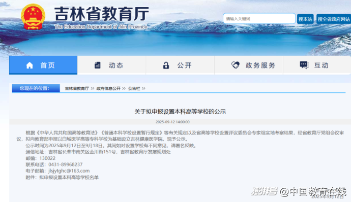 9月12日,吉林省教育厅发布《关于拟申报设置本科高等学校的公示》,根据《中华人民共和国高等教育法》《普通本科学校设置暂行规定》等有关规定以及省高等学校设置评议委员会专家组实地考察结果,经吉林省教育厅党组会议审议,拟向教育部申报以白城医学高等专科学校为基础设立吉林健康医学院。
