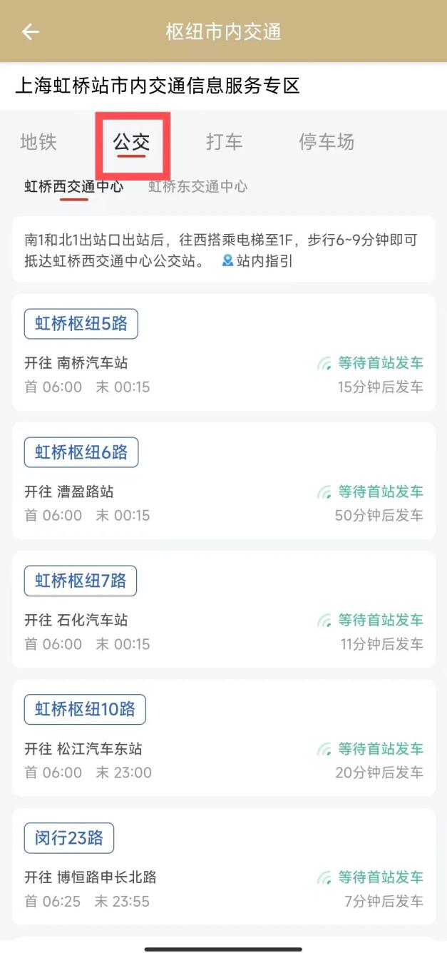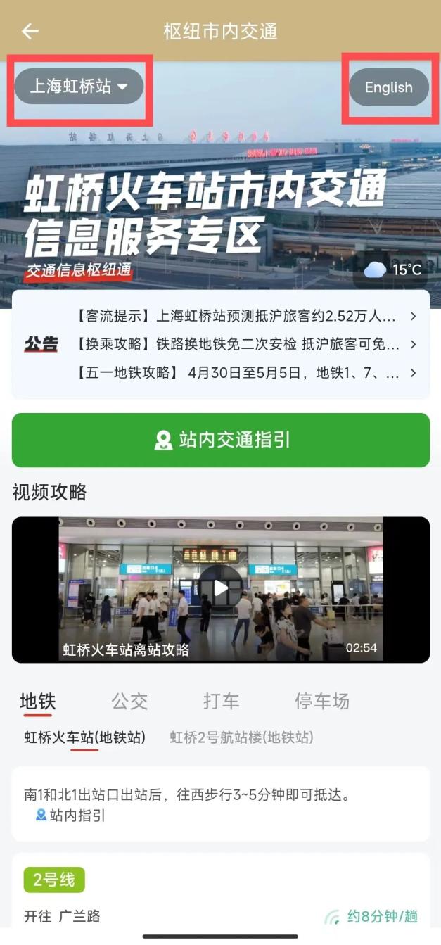 第一步:在界面上可以看到左上角的选站按钮,点开选站按钮即可看到上海的各大站点,选择“上海虹桥站”;右上角有中英文转换;信息服务专区可以看到公告、站内交通指引及公共交通方式。公告内容包括换乘攻略、客流提示、天气预警信息,站内指引即站内地图,旅客可根据地图到达各公共交通站点,公共交通方式包括地铁、公交、打车等。