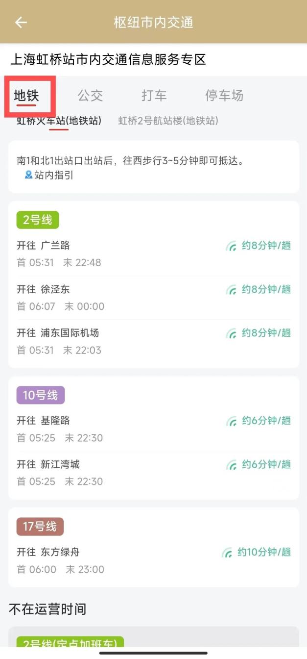 如果选择的是地铁,可以看到地铁站点到达方式、可选地铁线路、开往方向、首末班车时间及班次之间的时间间隔。