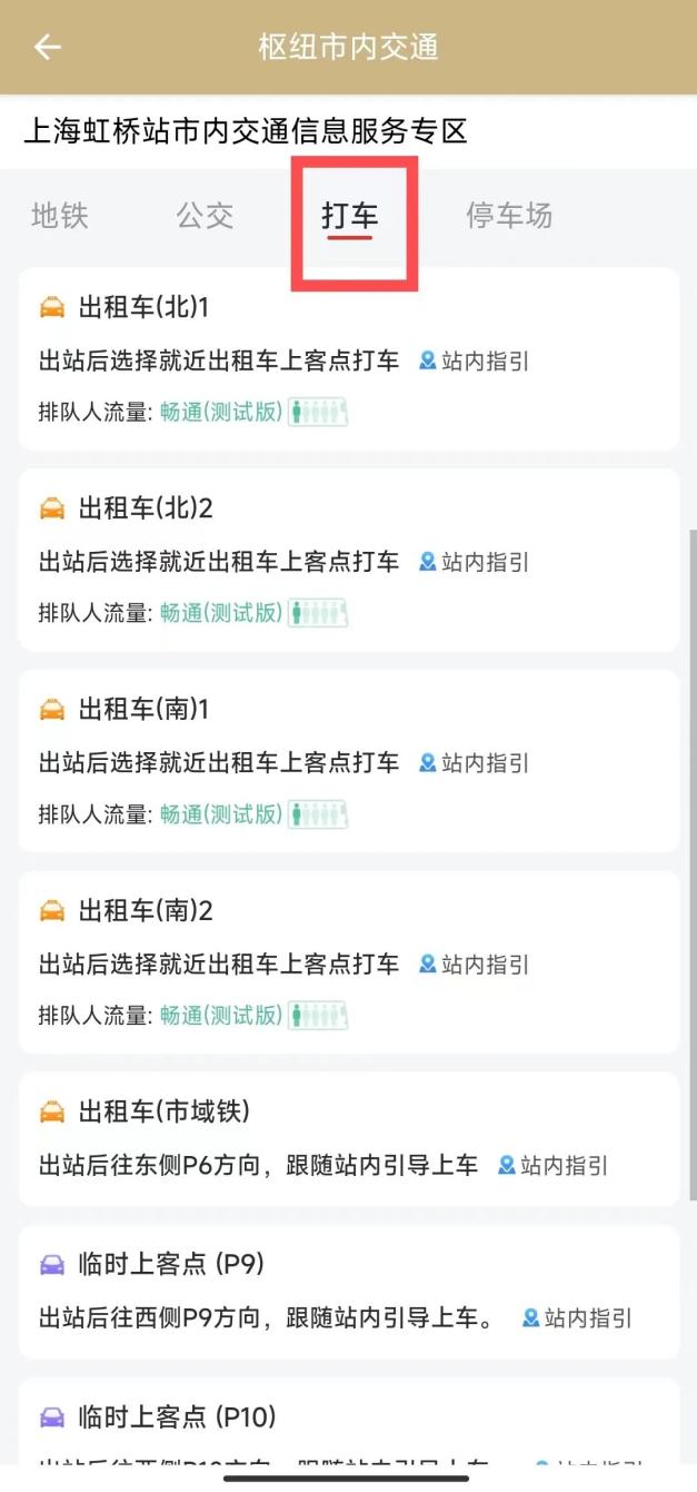 如果选择打车出行,则可以看到可选乘车站点(包括出租车、网约车等)、站点到达方式、站点排队情况等信息。