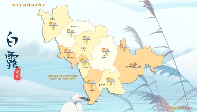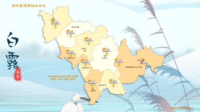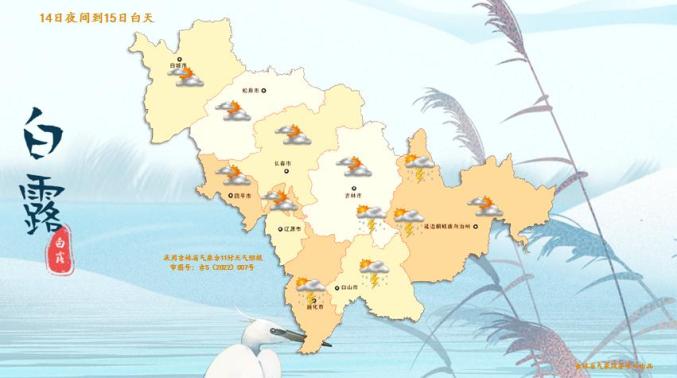 15日夜间到16日白天全省多云,白城、松原、长春、四平、辽源、吉林、通化、白山、延边西部有阵雨或雷阵雨。