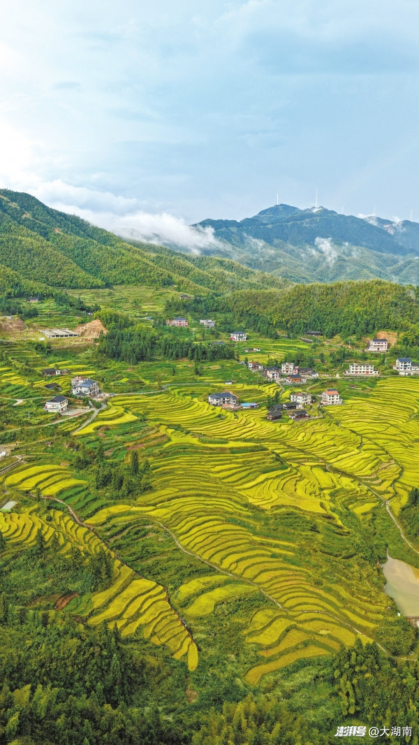 9月13日,湖南省娄底市新化县文田镇芭蕉山,夕阳为梯田的千层稻浪镀上金边,与蜿蜒的田埂、远山共同勾勒出当地特有的山地农耕画卷。曾文贵 摄