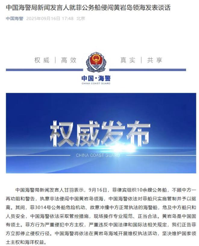 中国海警局新闻发言人甘羽表示,9月16日,菲律宾组织10余艘公务船,不顾中方一再劝阻和警告,执意非法侵闯中国黄岩岛领海,中国海警依法对菲船只实施管制并予以驱离。其间,菲3014号公务船危险机动、故意冲撞中方正常执法的海警船,危及中方船只和人员安全,中国海警依法采取管控措施,现场操作专业规范、正当合法。黄岩岛是中国固有领土。菲方行为严重侵犯中方主权,严重违反中国法律和国际法相关规定,我们正告菲方立即停止侵权行径。中国海警将依法在黄岩岛海域开展维权执法活动,坚决维护国家领土主权和海洋权益。