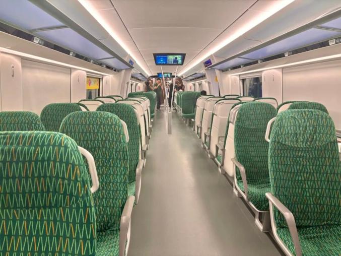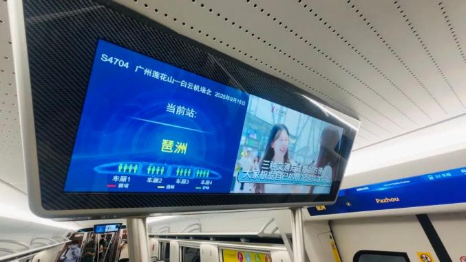 车厢内据介绍,广东城际将开行“飞霞-惠州北”“飞霞-肇庆”“肇庆-惠州北”“花都-惠州北”“白云机场北-佛山西”“白云机场北-东莞西”“白云机场北-竹料”“佛山西-东莞西”8条交路,串联起广州南站、广州北站、白云机场、金融城、琶洲等重要交通枢纽和商务区,实现“枢纽到枢纽”“中心到中心”“枢纽与中心”三个互达。