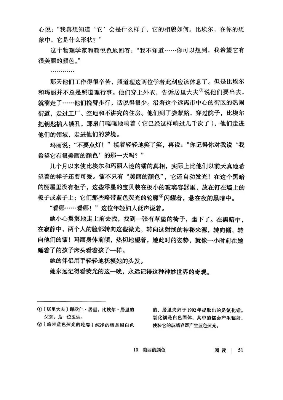 《美丽的颜色》一文生动描述了发现镭的那个夜晚:“有一天晚上,夫妇俩又回到了棚屋,他们还没有开门,居里夫人就说:‘不要点灯!’然后他们轻轻走进房间……在黑暗中,镭不仅‘自动发光’,而且在居里夫妇看来,它还散发着蓝色荧光,美丽极了。他们悄无声息地注视着那光芒,居里夫人的身体微微前倾,热切地望着这缕她付出如此巨大代价才获得的蓝色荧光。”